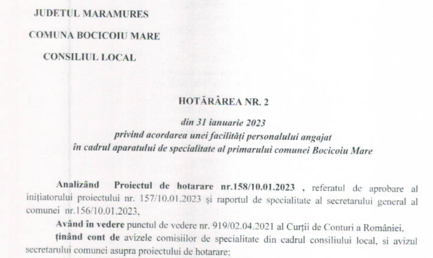 Exemplu de plagiat – un proiect de hotărâre pe ordinea de zi a ședinței consiliului local din 28.02.2023, copiat integral de pe site-ul primăriei Bocicoiu Mare, județul Maramureș.